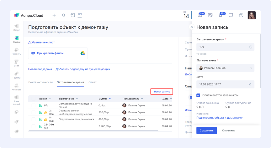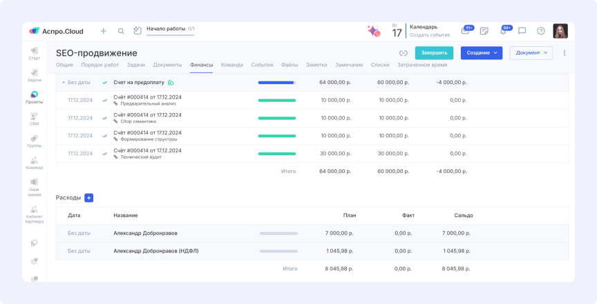 Может произойти ситуация, когда заказчику потребуются доработки или дополнительные услуги. Аспро.Cloud также позволяет не потерять эти расходы из виду и не забыть выставить счет.