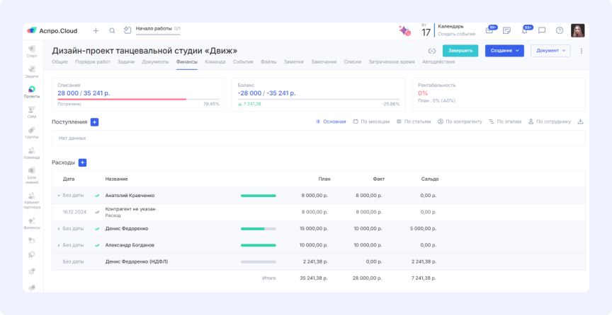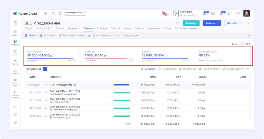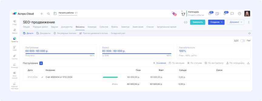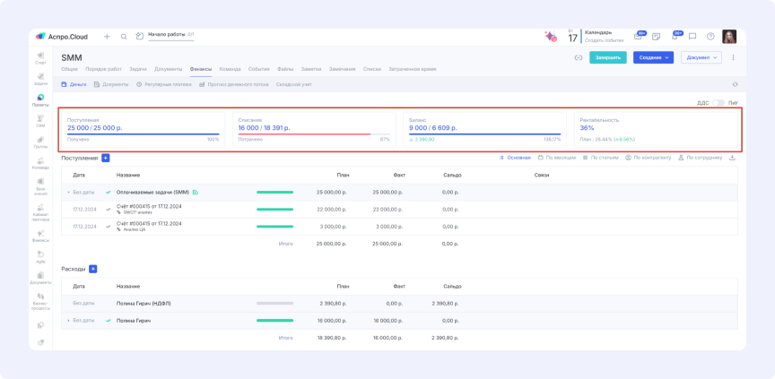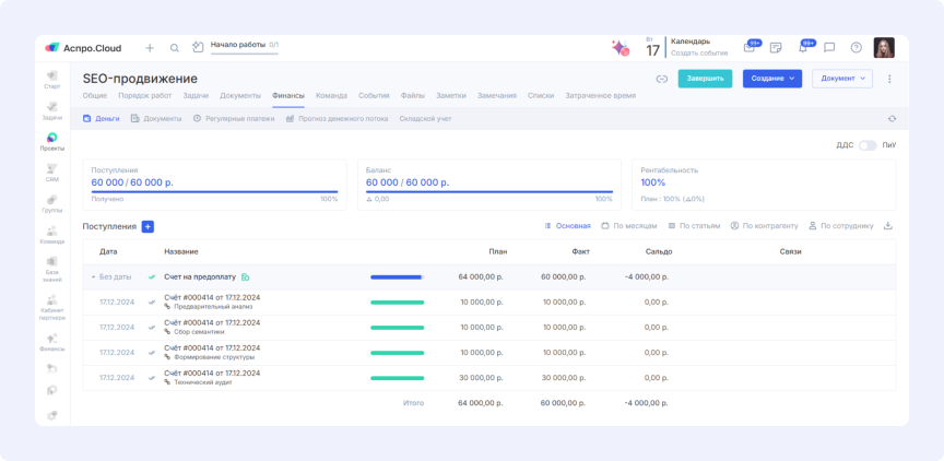 После получения оплаты система автоматически рассчитает рентабельность и баланс проекта, а также покажет отклонения от плана.