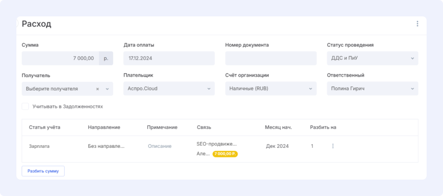 Если у вас настроено начисление налогов, система сформирует отдельную строку расходов. Это нужно, чтобы правильно составить общий отчет ДДС.