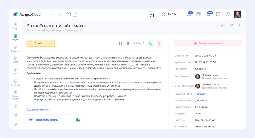 Но всегда есть риск, что сотрудники будут трекать время во время отдыха или просто растягивать выполнение задачи. Поэтому важно объяснять последствия таких ситуаций и при необходимости применять санкции. Можно также детализировать затраченное время в рамках задачи, чтобы видеть полную картину рабочего процесса. Например, к каждой записи тайм-трекера в Аспро.Сloud можно добавлять комментарий.