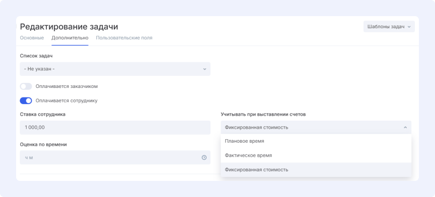 В этом случае вы заранее определяете, сколько потребуется времени на выполнение каждой задачи, и устанавливаете ставку за час. Система позволяет фиксировать переработки, но не берет такие расходы в расчет.