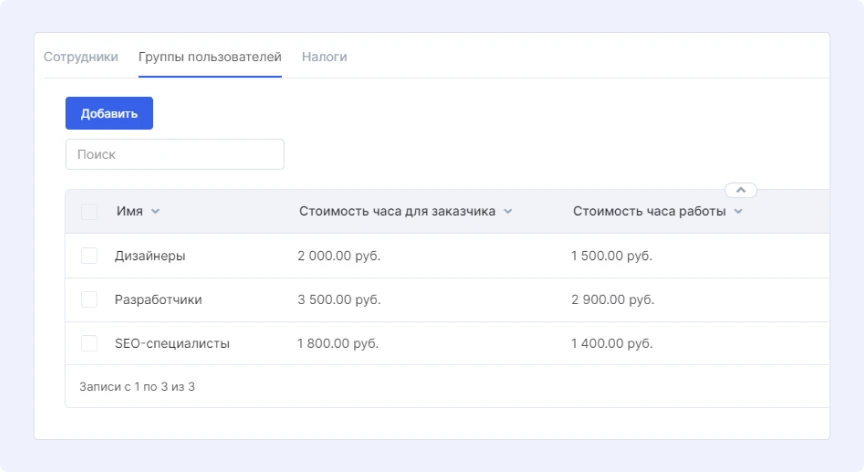 Вы можете задавать стоимость часа для отдельных сотрудников. Например, у стажера и middle-специалиста разная оплата. Также в Аспро.Cloud пользователей можно объединять в группы по отделам и указывать для них базовую ставку.