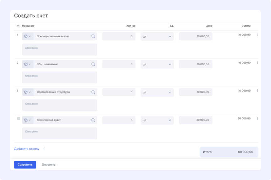 При выставлении счета необходимо указать все задачи, которые вы будете выполнять в рамках проекта. Их можно добавить сразу из карточки проекта или заранее создать каталог услуг внутри системы.