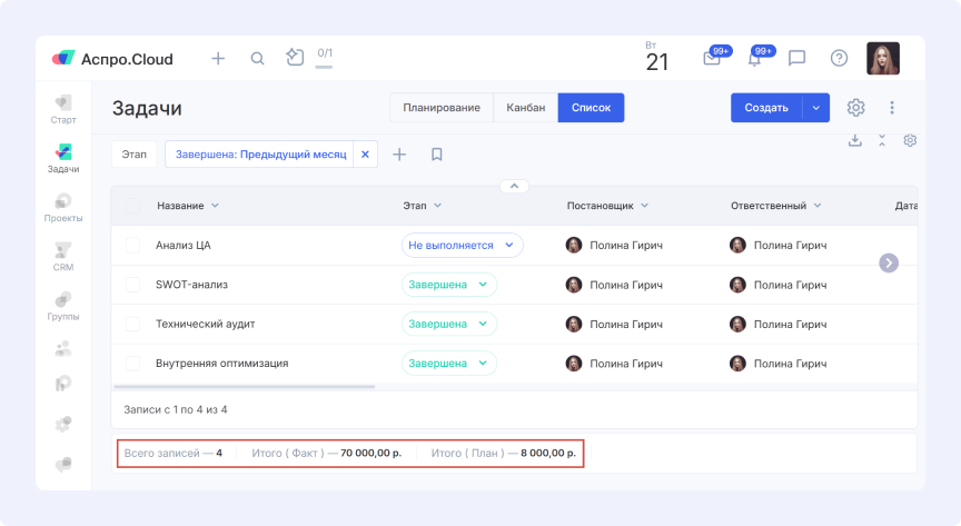 Аспро.Cloud собирает отчет по всем задачам сотрудника и показывает итоговую сумму для выплаты.