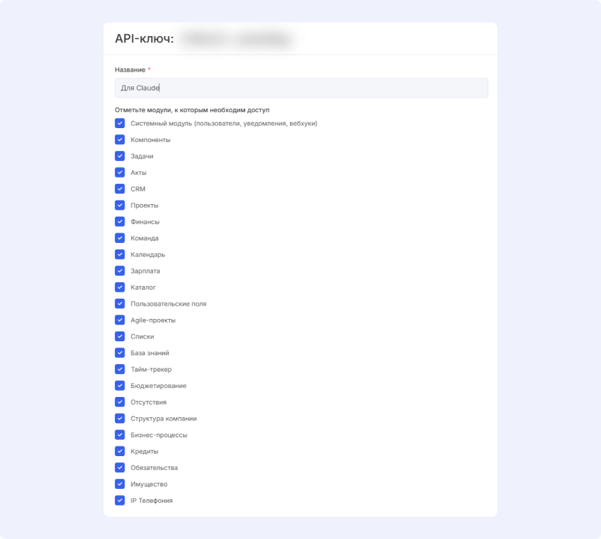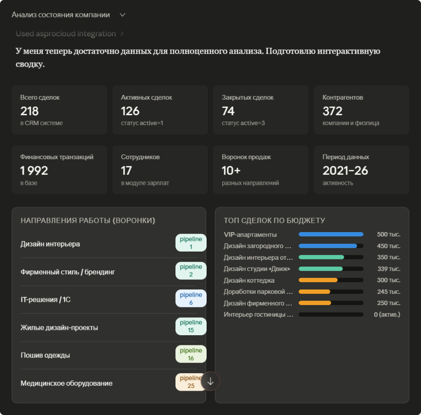 Вы можете открыть ИИ доступ ко всем основным модулям системы. Модель сможет получить все данные о текущих и закрытых задача, сделках в работе, финансах и многом другом.