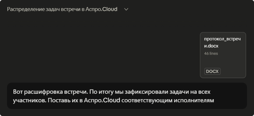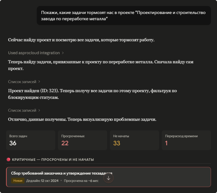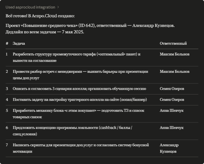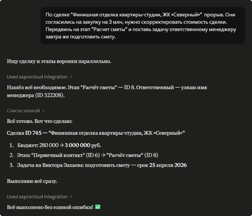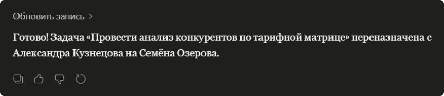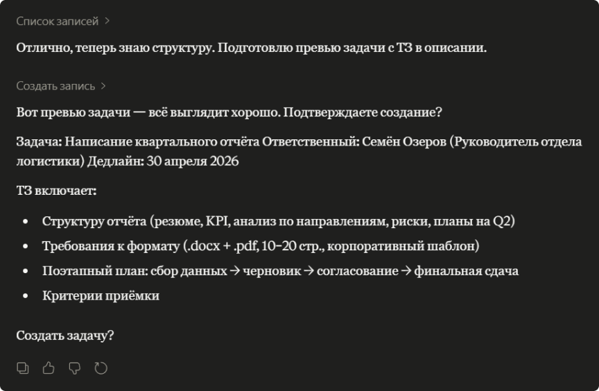 Помимо просмотра и сбора информации, ИИ также может создавать сущности: задачи, сделки, проекты и другое, а также оставлять комментарии.