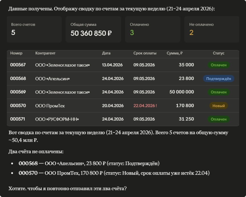Анализ статусов и отправка счетов: запросите сводку по всем отправленным счетам — и попросите ИИ повторно выставить просроченные.