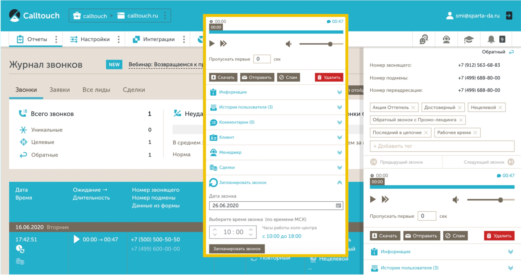 Сервис помогает работать со сквозной аналитикой, отслеживать звонки и управлять рекламой. Инструменты сервиса позволяют собрать данные для анализа эффективности маркетинга, воронки продаж и бизнес-процессов компании.