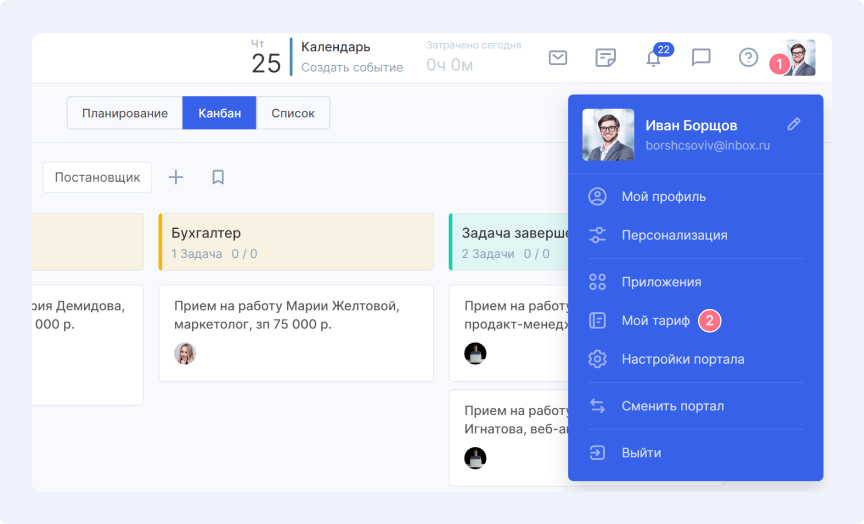 После регистрации и входа в систему нажмите на портрет в правом верхнем углу (1) и через меню перейдите на страницу «Мой тариф» (2).