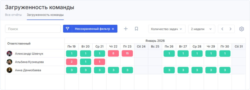 В модуле «Тайм-трекер» появился отчет «Загруженность команды». Он сразу показывает, как нагрузка распределяется между сотрудниками в течение дней или недель.