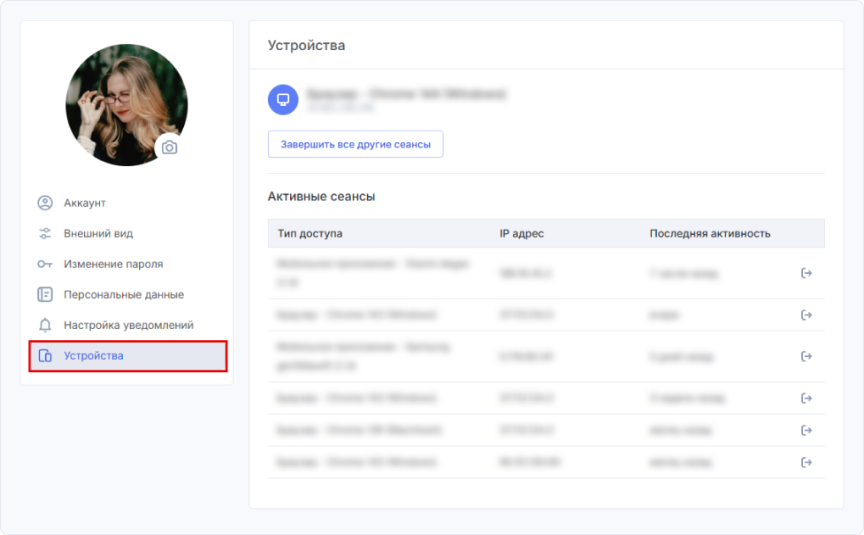 В профиле пользователя теперь доступен менеджер сессий — список всех устройств, с которых происходили входы в систему. С его помощью вы можете: