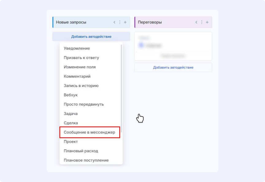 Просто создайте в CRM автодействие «Сообщение в мессенджер». Выберите канал, бота, укажите получателя и текст — система сама отправит клиенту приветствие или напоминание.