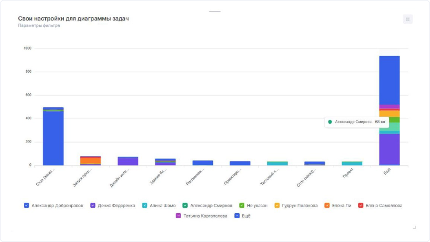 - фокусироваться на важном: фильтруйте данные по проекту, статусу или исполнителю;