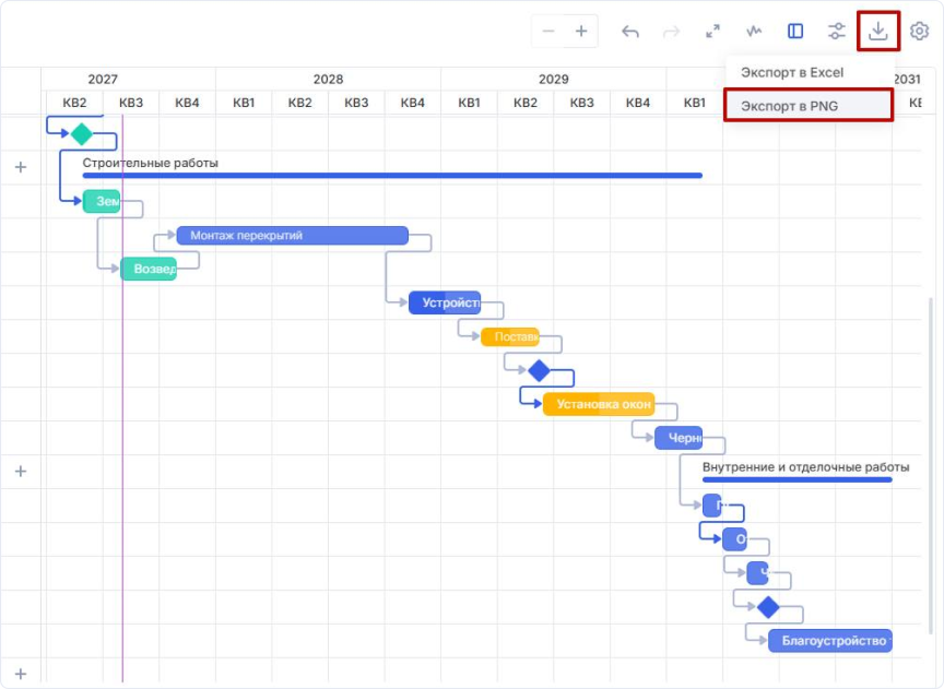 Для выгрузки диаграммы Ганта нажмите на соответствующую иконку в правом верхнем углу и выберите формат для экспорта. Подробнее о том, как экспортировать диаграмму Ганта можно прочитать в нашей документации.
