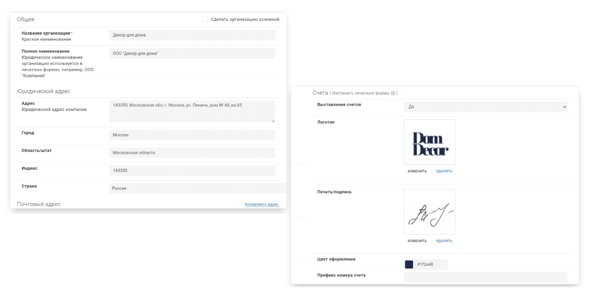 Выполняя настройку нескольких организаций в системе, обратите внимание, что одну из них можно сделать основной по умолчанию (ту, с которой вы планируете выставлять больше счетов, актов и предложений) – и она будет подставляться по умолчанию, а при необходимости ее всегда можно заменить.
