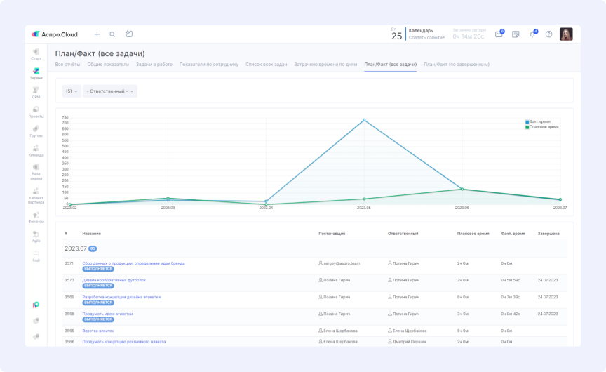 Причем руководитель может понять, укладывается ли сотрудник в план, уже на стадии выполнения задачи. Для этого есть отдельный отчет. Это помогает вовремя обнаружить проблему и устранить ее.