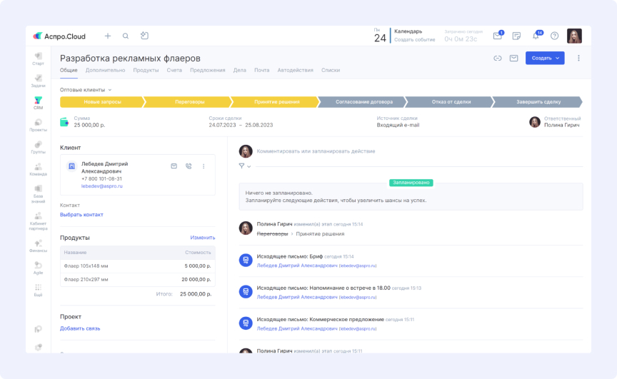 Каждый менеджер подключил свой почтовый ящик к Аспро.Cloud. Теперь сотрудникам не приходится переключать окна, чтобы проверить письма. Система автоматически собирает все поступающие заявки и создает карточку клиента, в которой хранится вся история взаимодействия. Менеджер может ознакомиться с деталями сделки и отправить ответ прямо из системы в один клик.