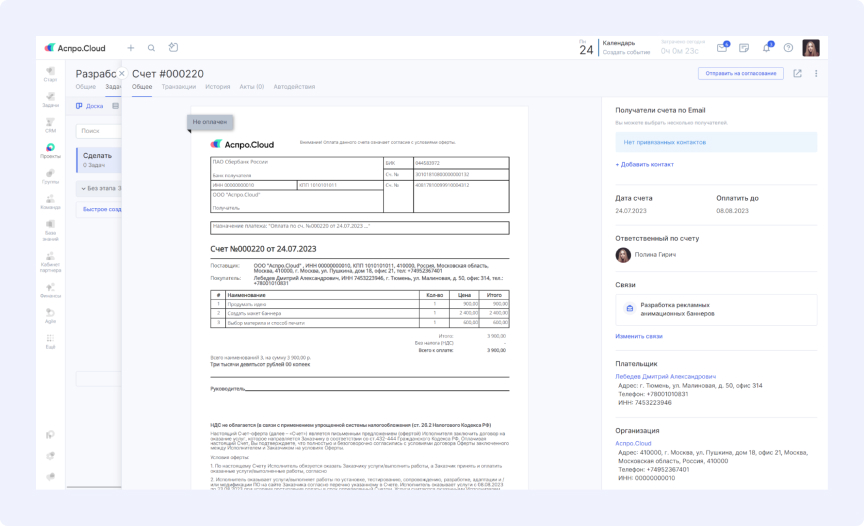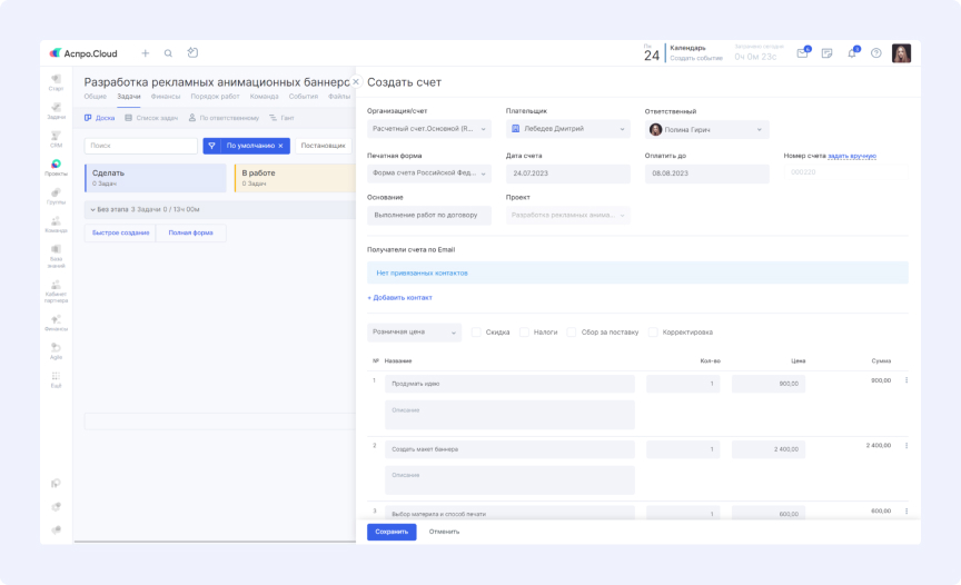 Когда придет время выставить счет, менеджеру будет достаточно создать его по затраченному времени. Система автоматически посчитает сумму выполненных работ за определенный период.