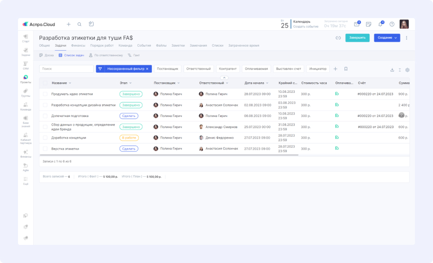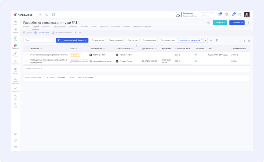 Специалисты Аспро.Cloud разработали и добавили фильтр в список задач, с помощью которого можно видеть количество оплачиваемых и неоплачиваемых задач по всему проекту или отдельному сотруднику.