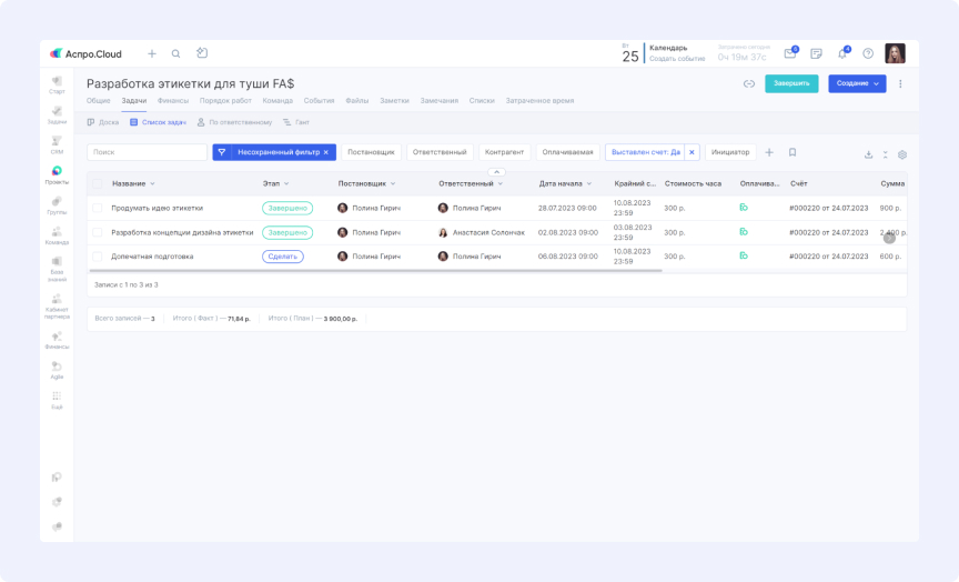 Для этого разработчики Аспро.Cloud добавили в список задач поле «Сумма». Теперь руководители могут видеть, сколько заказчик должен заплатить за отдельную задачу и проект в целом. Доработка позволила руководителям отслеживать расхождения между планируемой прибылью и фактической, и на основе этих данных анализировать причины несовпадений.