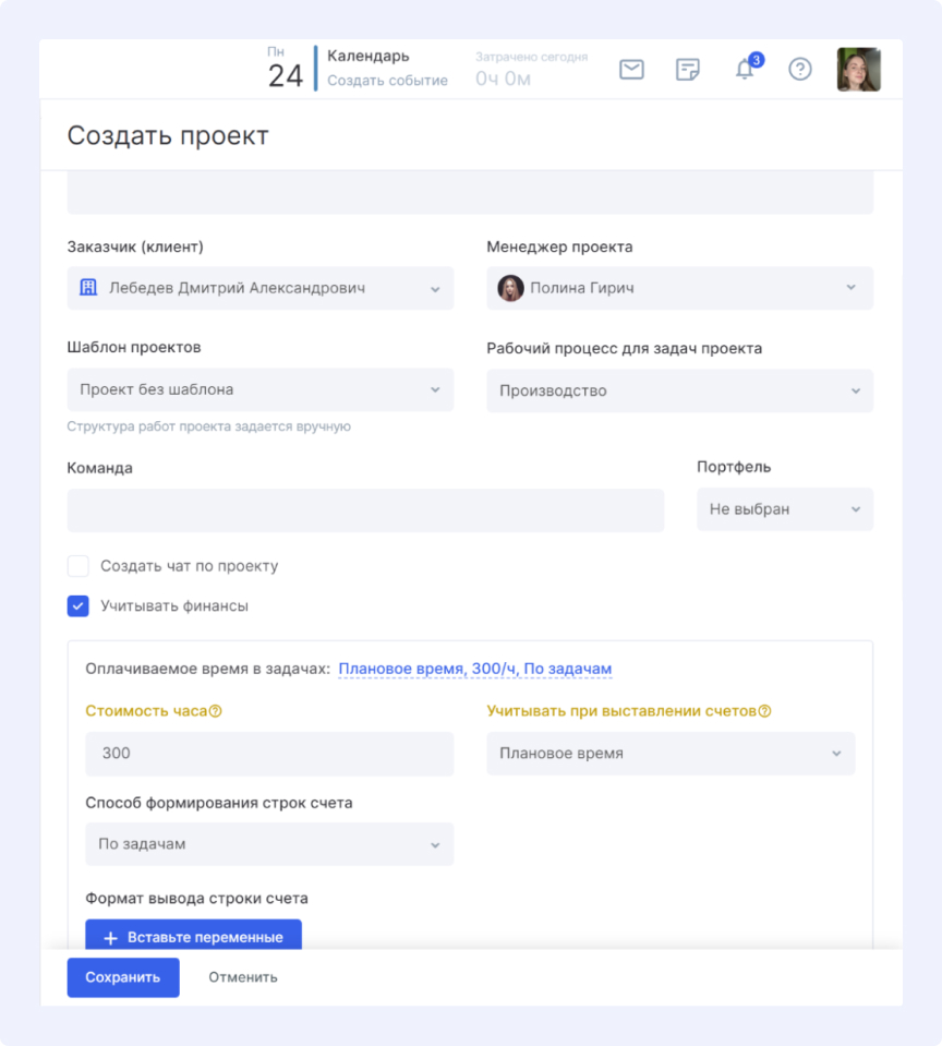 Первое, что делает менеджер — создает проект и настраивает оплачиваемое время так, чтобы при выставлении счета оно считалось исходя из плана.