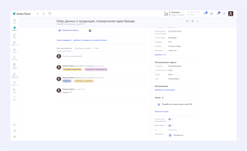 Аспро.Cloud мы используем больше как систему для планирования, нежели как CRM. Мне, как руководителю, очень удобно следить за работой сотрудников: что делали вчера, что будут делать сегодня. Это помогает быть уверенным в том, что наш клиент получит качественный результат вовремя. Нам понравилось, что с помощью Аспро.Сloud мы не только перестроили рабочий процесс, но и сделали это максимально быстро. Нам не пришлось искать систему, которая бы была разработана для сферы дизайна. Ведь все, в чем мы нуждались, специалисты доработали или подсказали, как это получить.