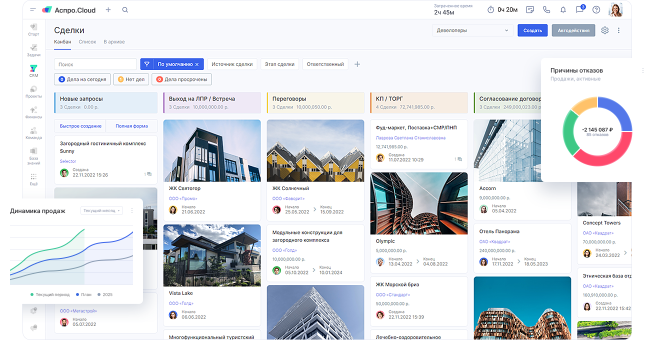 Аспро.Cloud — это готовая CRM-система, которую можно начать использовать сразу после регистрации. Это обеспечивает быстрый запуск без долгой подготовки. В то же время, мы предлагаем услуги по внедрению «под ключ» для компаний, которым нужна глубокая кастомизация под уникальные бизнес-процессы. Таким образом, у вас есть выбор: использовать ее как есть, ведь это готовая система, или заказать комплексное внедрение. Наша облачная система очень гибкая и адаптируется под ваш бизнес.