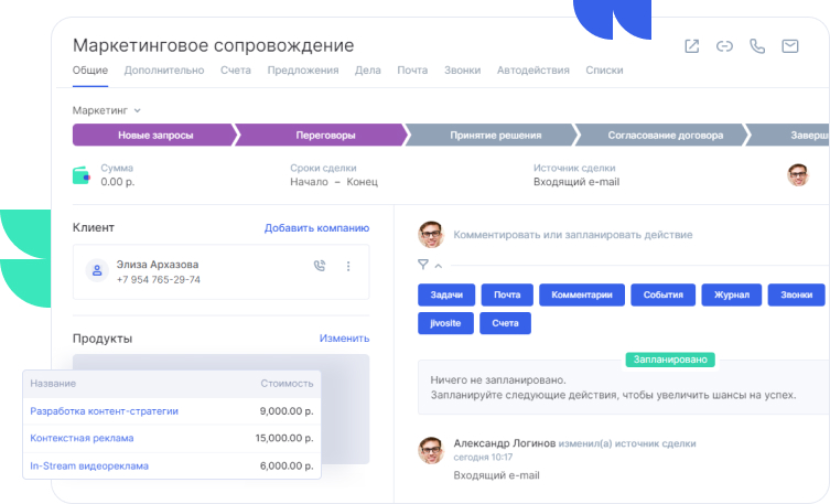 CRM-программа для продаж автоматически соберет поступающие заявки из разных каналов коммуникации. В сделке хранится история взаимодействия с клиентом, поэтому вы сможете отследить все этапы реализации. Повышайте качество обслуживания вместе с функциями Аспро.Cloud.