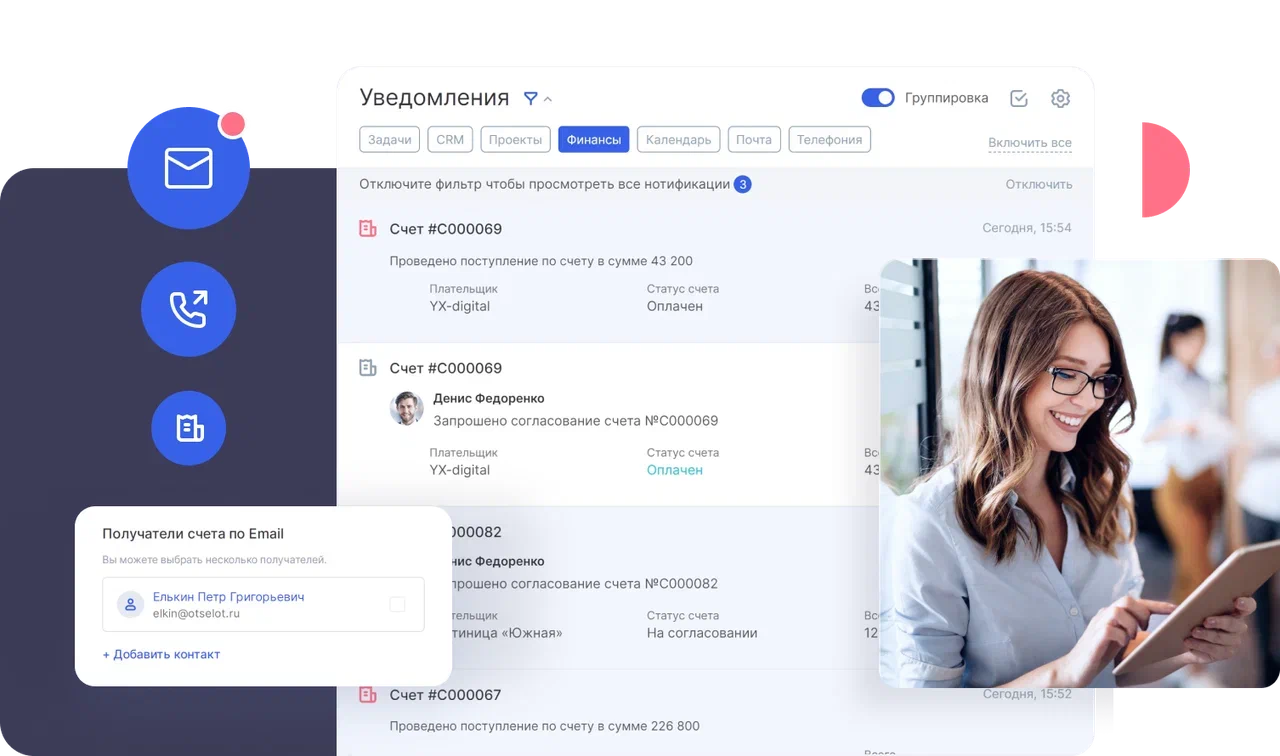 Доведите сделку до логичного завершения: в Аспро.Cloud можно сформировать счет за несколько кликов, отправить клиенту и отследить статус оплаты. Автодействия в системе уведомят менеджера, если деньги долго не поступают или повторно вышлет счет клиенту.