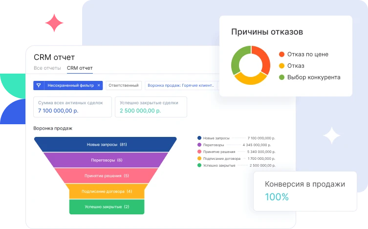 Отчет CRM покажет количество заявок из разных источников за выбранный период, сколько было выигранных и проигранных сделок, конверсия продаж. Анализируйте причины отказов и снизьте их благодаря новым скриптам или улучшению ваших продуктов/сервиса. В отчете вы сможете наглядно увидеть, сколько денег было упущено на разных этапах воронки продаж.