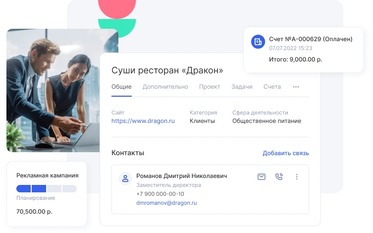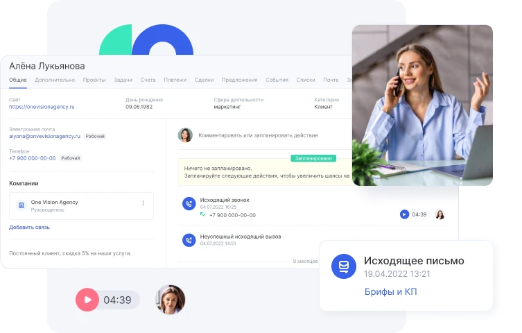 Чтобы более детально изучить успешные или неудачные продажи, можно перейти в карточку клиента. Сделки, предложения, письма, проекты, дела, платежи, счета, документы — вся ценная информация по клиенту доступна в пару кликов. Руководитель отдела продаж с легкостью сможет получить ее и использовать для успешного анализа сделки. Например, можно прослушать разговор с клиентом и разобрать ошибки.
