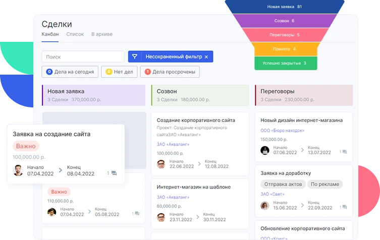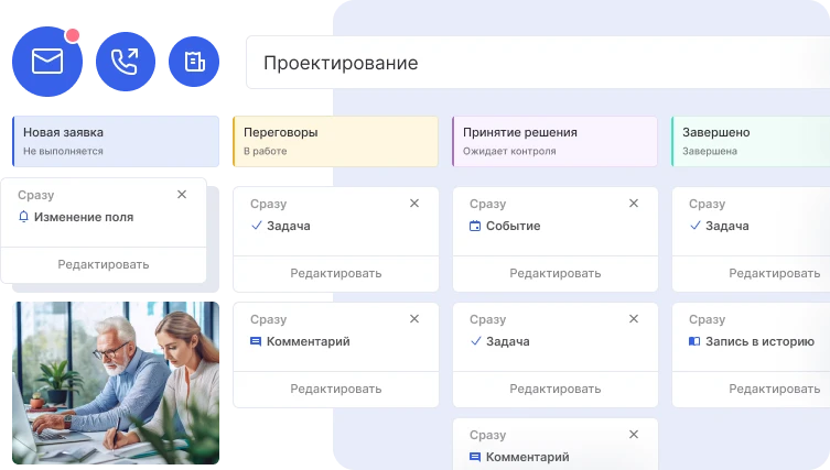 Все сделки можно представить в виде kanban-доски. Анализируйте загрузку менеджеров и этапы сделок. На каждом этапе прописана сумма выручки, что мотивирует сотрудников закрывать их быстрее. Настройте автодействия, чтобы менеджеры не проигрывали сделки из-за человеческого фактора. Например, если сотрудник не взял задачу в работу спустя два дня после ее создания, руководителю придет об это уведомление 一 автоуведомление сообщит руководителю, что нужно вмешаться.
