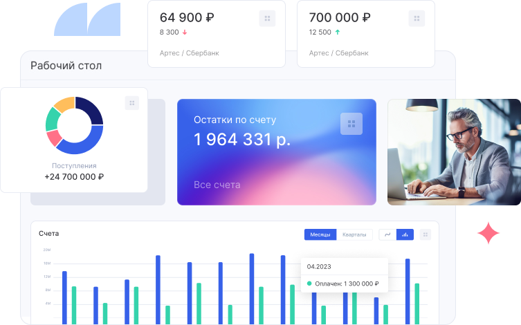 Разместите виджет на рабочем столе с графиком поступлений. Отслеживайте динамику выручки и прибыли, а также рентабельность. Добавьте виджет «Поступления по статьям учета» и проанализируйте, что приносит компании большую прибыль. Принимайте управленческие решения на основе данных, а не интуиции.
