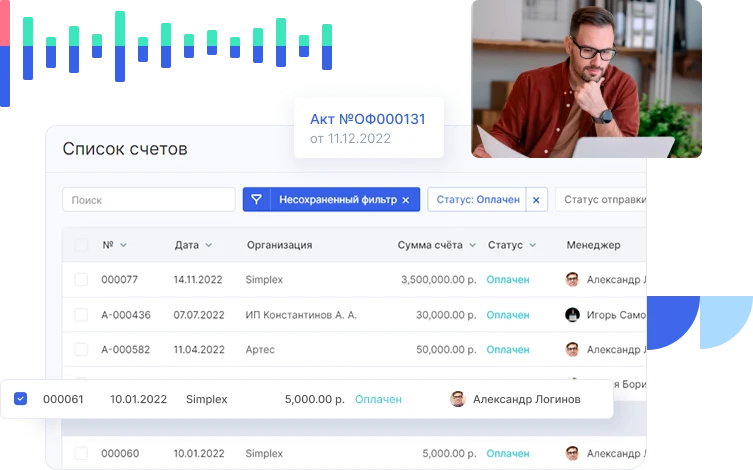 В CRM Аспро.Cloud вы сможете проанализировать оплаченные и незакрытые счета в разрезе каждого месяца. В наглядном графике вы увидите, сумму созданных и оплаченных счетов. Отчет покажет информацию об ожидаемых оплатах и просроченных платежах. Руководитель всегда будет в курсе, успевает ли компания выполнить план продаж и принять необходимы меры. Например, по сделкам с ожидаемыми оплатами можно отправить напоминания, а по просроченным выставить новый счет.