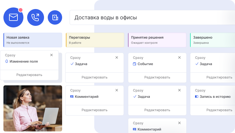 CRM-система берет на себя часть рутинной работы и позволяет менеджерам уделять больше времени покупателям. В этом помогает автоматизация доставки воды. Все, что нужно от вас, — настроить условия. Какие есть сценарии использования: