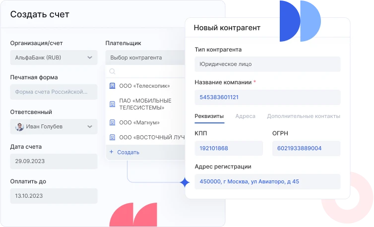 При создании документа вам останется выбрать нужный шаблон, а дальше программа сделает все за вас. Заполнит данные и реквизиты контрагента, укажет стоимость услуг и выведет итоговую сумму заказа. Это помогает снижению человеческого фактора.