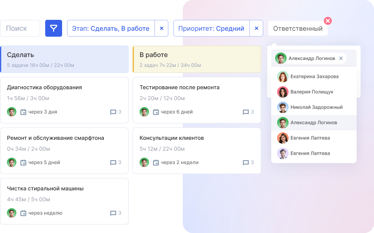 Аспро.Cloud — это не только система CRM для сервисного центра, но и таск-трекер для эффективной работы сотрудников. Ставьте специалистам задачи и эффективно проводите контроль этапов ремонта с помощью канбан-доски. Также вы можете организовать совместную работу сотрудников: просто добавьте в поручение несколько специалистов. Все будут в курсе изменений и смогут вовремя подключиться к процессу.
