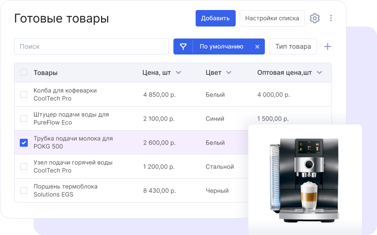 Кроме этого, вы можете установить цену запчастей и в два клика добавлять товары к сделке. Благодаря этому система автоматически рассчитает сумму сделки с учетом стоимости вашей работы и деталей.