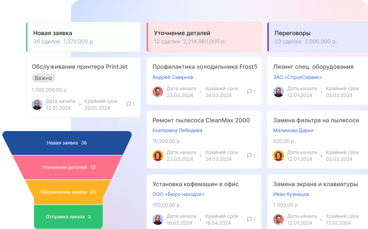 Воронка продаж. Визуализируйте путь клиента и отслеживайте, на каком этапе находится каждый заказ. Это поможет легко выявлять узкие места в работе, оперативно реагировать на задержки и оптимизировать взаимодействие с клиентами. Также вы можете проводить контроль этапов ремонта, для этого добавьте соответствующие статусы в воронке.