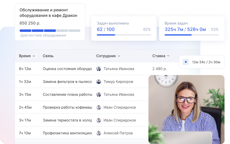 Программа также позволяет эффективно работать по почасовой оплате. Для этого в Аспро.Cloud есть встроенный тайм-трекер. Специалисты фиксируют затраченное время, а система автоматически рассчитывает стоимость задач и показывает, сколько вы должны заплатить.