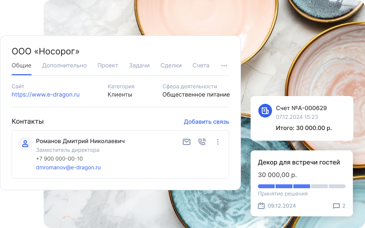 Карточка клиента. CRM сохраняет всю историю взаимодействия с покупателем в его карточке: пожелания, сделки, счета, оплаты и комментарии менеджеров. Благодаря этому история заказов и клиентов всегда под рукой, что упрощает взаимодействие с покупателем и повышает его лояльность. Вам не нужно начинать диалог с нуля, даже если клиент обратился повторно.
