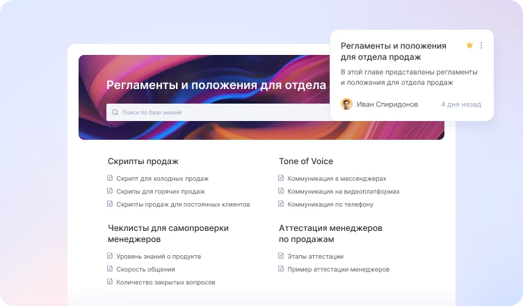 Удобный интерфейс для менеджеров в базе знаний позволяет легко найти нужную информацию, дополнить ее или создать новый материал с лучшими практиками.