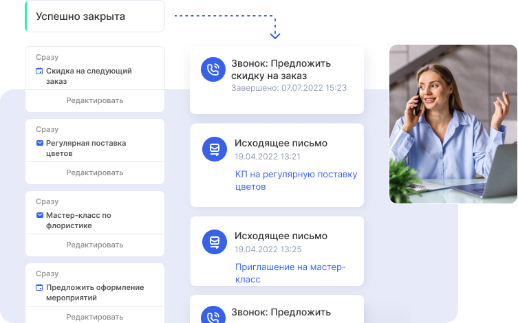 Если вы работаете с корпоративным клиентом, то после завершения сделки система может отправить коммерческое предложение на оформление мероприятий цветами и декором. Это удобно, если у вас много сопутствующих товаров и услуг.