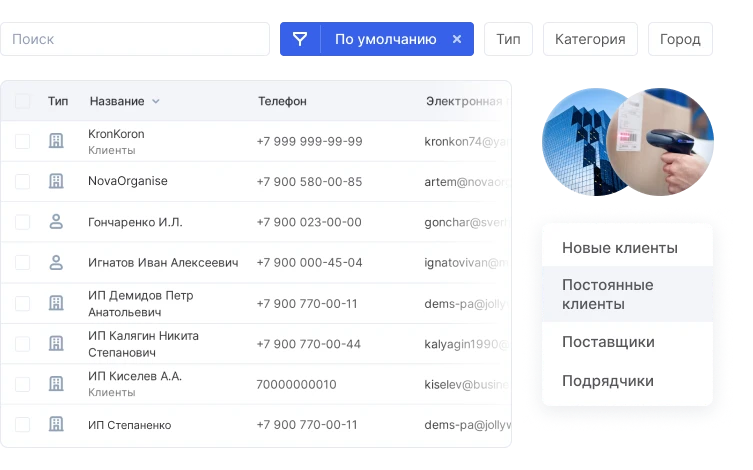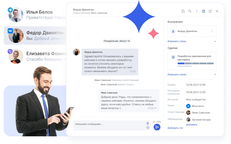 База клиентов и поставщиков. Система автоматически фиксирует в едином списке контакты всех, кто когда-либо обращался к вам. Так вы сможете быстро найти нужного клиента или поставщика и связаться с ним. Также это позволяет сегментировать базу по любым признакам, предлагать более релевантные позиции и повышать шанс на повторную сделку.