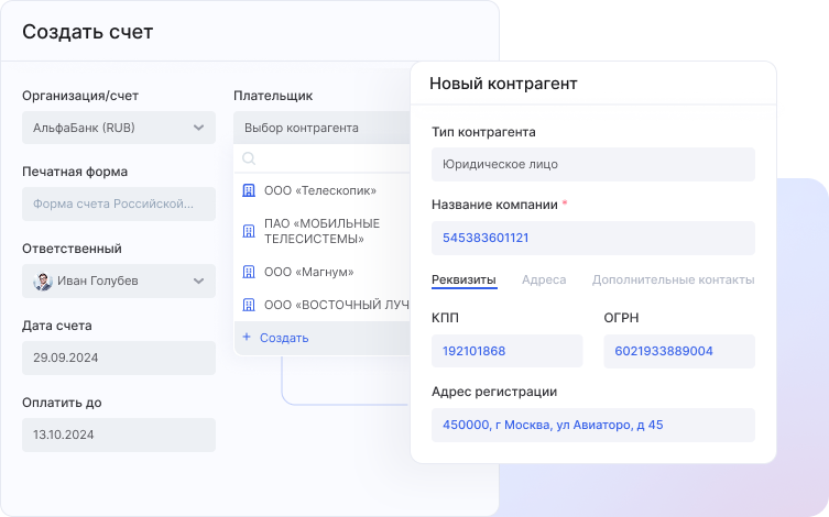 Коммерческие предложения и счета. Создайте шаблоны документов в удобном конструкторе, а CRM автоматически заполнит нужные данные. Например, контакты покупателя, стоимость позиций и итоговую сумму сделки. Это поможет ускорить работу и избежать ошибок. Также Аспро.Cloud может автоматически отправлять разные КП в зависимости от услуг и товаров. Вам останется только конвертировать предложение в счет в два клика.