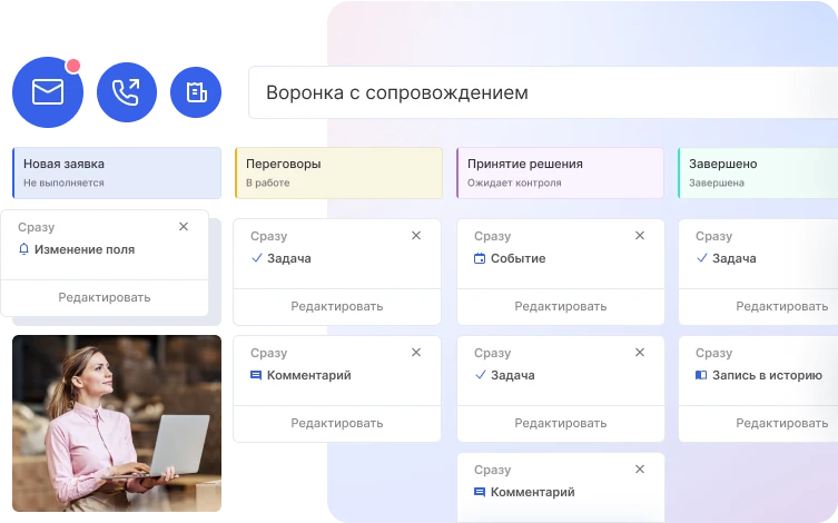 Сразу после успешного закрытия сделки система создает задачу на созвон и назначает ответственного менеджера. Сотрудник мгновенно получает уведомление и может связаться с покупателем: поблагодарить за заказ и предложить индивидуальную скидку. Это повышает лояльность и подталкивает к повторному обращению.