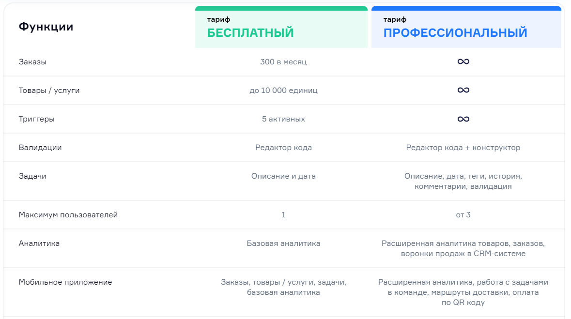 Как и в amoCRM, в этой CRM расчет стоимости осуществляется на количество пользователей. В системе есть 5 тарифов от 454 до 1 049 ₽/мес. Стоит отметить, что воронка продаж есть только в последних двух. Также доступен бесплатный тестовый период на 14 дней.