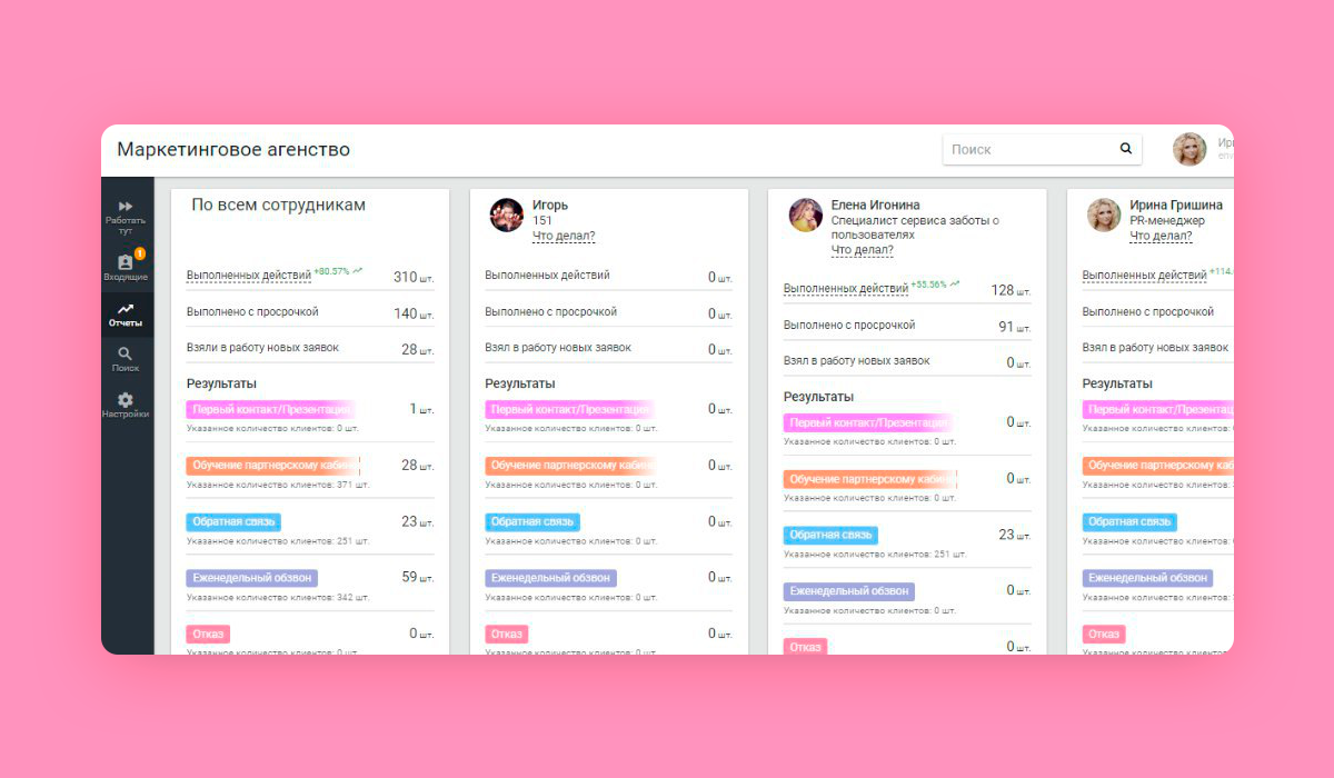 Отчеты о продажах. Программа для ведения клиентов соберет информацию о сделках в виде таблиц и графиков. Это позволит анализировать эффективность продаж и количество успешных сделок за любой промежуток времени. Отчеты можно сформировать по времени, этапам продаж и конкретному специалисту. Это поможет определить, на каком этапе происходит больше всего отказов, выявить проблемные зоны и скорректировать работу команды.