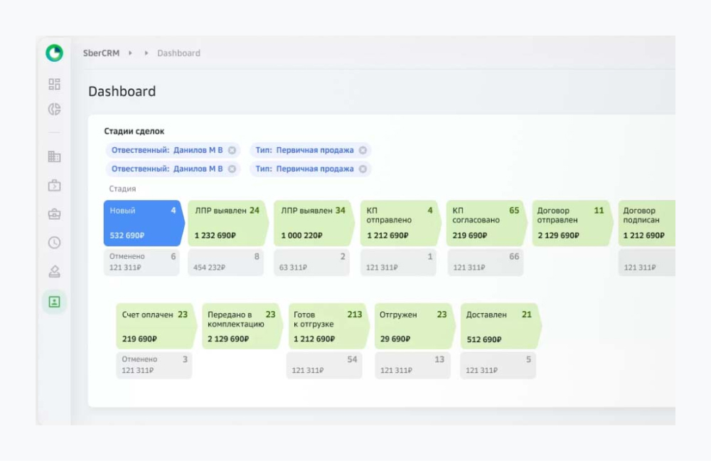 SberCRM — программа для базы данных клиентов от «Сбера». Подойдет тем, кто использует другие сервисы экосистемы, такие как SberCloud, «СберЛогистика» и «СберБизнесID».