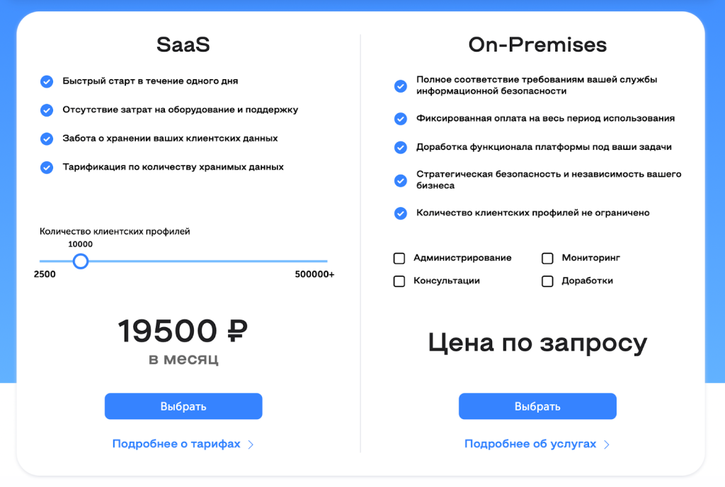 - Стоимость облачной версии от 19 500 ₽/мес за 10 000 профилей.